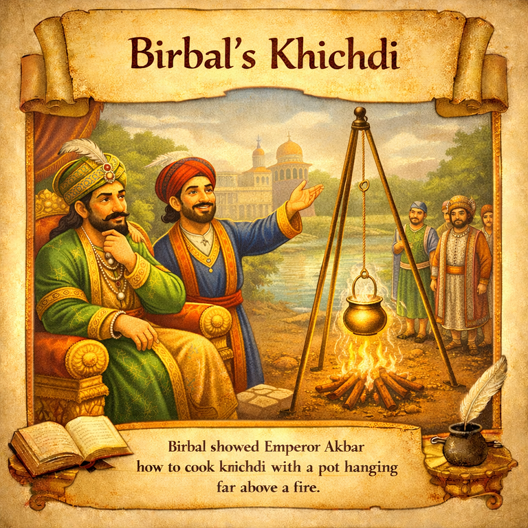 Birbal decided to teach Akbar a lesson. The next day he hung a pot of khichdi high on a tree and lit a small fire far below it.