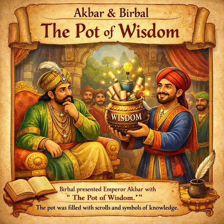 image.png2.41 MBOne day, Emperor Akbar asked Birbal, "Can you bring me a pot full of wisdom?" Birbal immediately took an empty pot, went out into the city, filled it with a small gourd (or simply left it empty, depending on the version), and brought it back to the court.