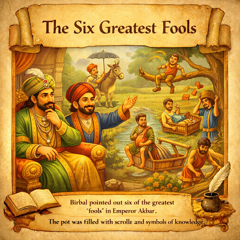 image.png2.32 MBAkbar asks Birbal to find the six biggest fools in the kingdom. Birbal brings four, and when asked for the rest, he identifies himself (for wasting time) and Akbar (for asking for the fools), teaching the emperor a lesson about the nature of foolishness.