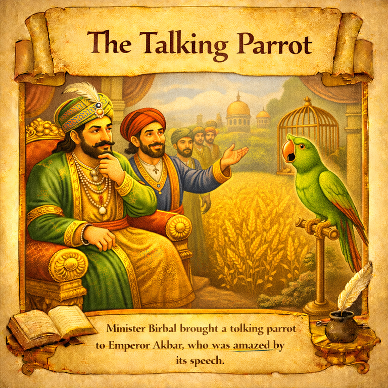 ← Back to Akbar Birbl Storys story 11The Talking Parrot Akbar buys a talking parrot that refuses to speak, so he tasks Birbal with teaching it. Birbal tells the parrot that in a cage, words lose their meaning. Realizing his error, Akbar frees the bird. image.png 2.29 MB